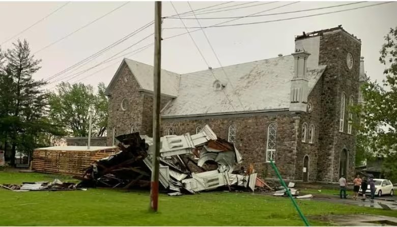 The wind is of a type called derecho, where basically very strong winds blow straight in one direction at very high speeds. Here's a link to the Wikipedia site: Derecho