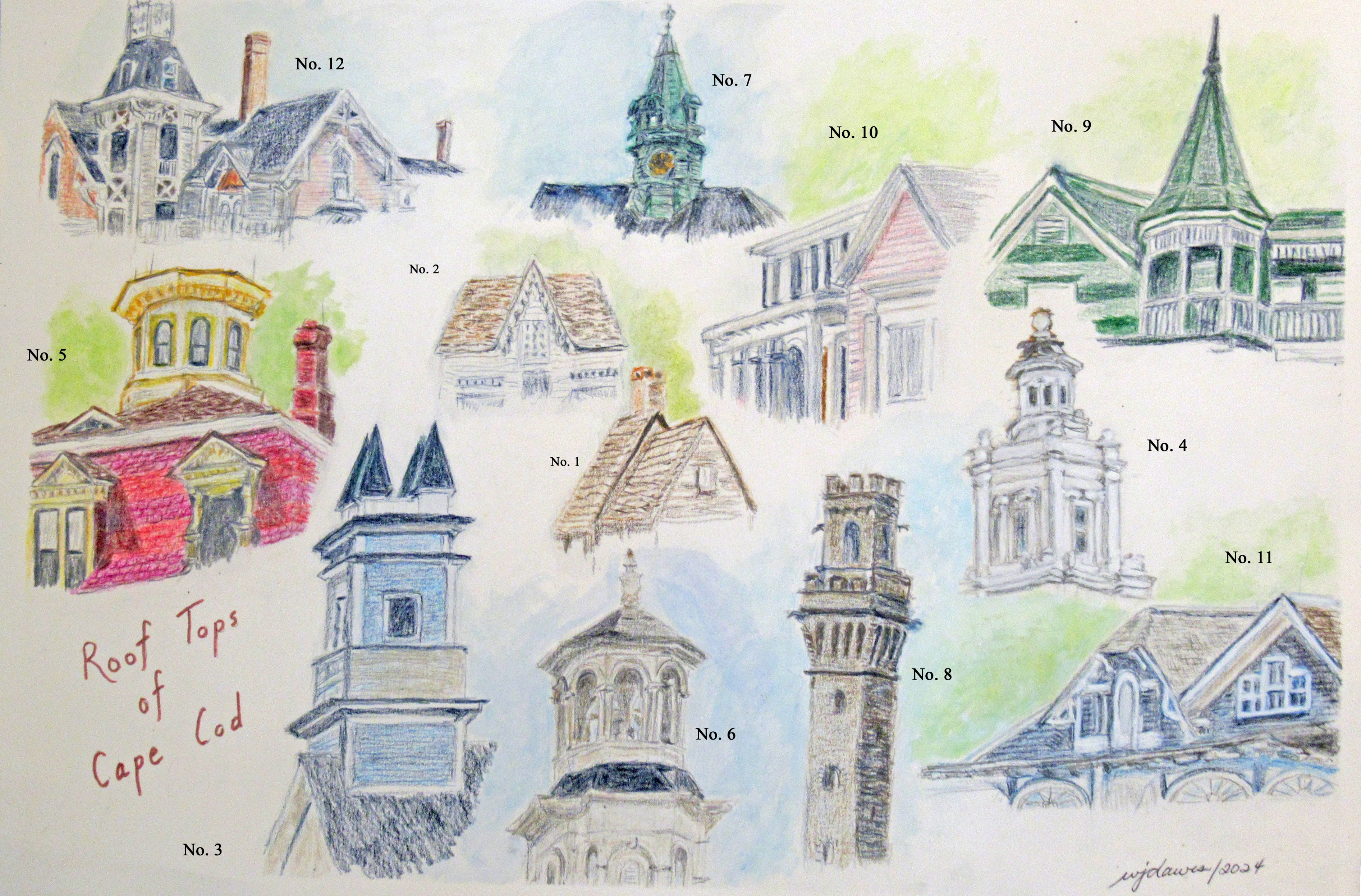 G03-04: Rooftop in Eastham, Cape Cod USA ~ Coloured Pencil Drawing on Paper, Unframed 8.5" x 7.5" ~ $40